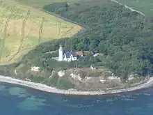 A lighthouse of 19 m, was erected on the site in 1858, named after the old castle. Because of the cliffs and the castle hill, it has a focal height of 36 m. On clear days it is possible to see Zealand, the head of Funen, parts of northern Funen, Æbelø, Endelave and the long coastline of Jutland.
