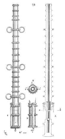The Veuglaire was up to 2 meters (8 feet) long, and weighing from 150 kg to several tonnes, and compares to the Crapaudins or Crapaudaux, which were shorter (4 to 8 feet) and lighter than the Veuglaires.[3] The Veuglaires were usually breech-loading, and therefore used a separate "powder chamber" (boîte à poudre) in which powder and ball were located upon loading,[4][5] and the main body of the cannon was formed of a tube opened at both ends.