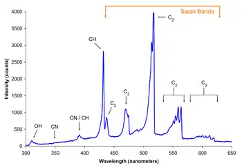 The analysis of vibronic spectra of diatomic molecules provides information concerning both the ground electronic state and the excited electronic state. Data for the ground state can also be obtained by vibrational or pure rotational spectroscopy, but data for the excited state can only be obtained from the analysis of vibronic spectra. For example, the bond length in the excited state may be derived from the value of the rotational constant B′. In addition to stable diatomic molecules, vibronic spectroscopy has been used to study unstable species, including CH, NH, hydroxyl radical, OH, and cyano radical, CN.[17] The Swan bands in hydrocarbon flame spectra are a progression in the C-C stretching vibration of the dicarbon radical, C2 for the electronic transition.[18] Vibronic bands for 9 other electronic transitions of C2 have been observed in the infrared and ultraviolet regions.[2]