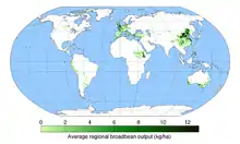 Botrytis fabae is one of the worst diseases in V. faba. Foliar damage, reduced photosynthesis, reduced bean productivity. B. fabae switches from non-aggressive growth to aggressive pathogenicity under the combination of increased temperature and humidity, and this is worsened by low soil potassium and phosphorus, and by the higher humidity caused by higher seeding rates. The non-aggressive phase is marked by small red-brown leaf lesions, and sometimes the same on stems and pods. Treatment is less effective than prevention. Early planting avoids the problematic combination of high temperature and humidity in late spring into early summer. Decreasing seeding rate or thinning after emergence is also effective. Foliar fungicide is effective.[10] If V. faba flowers during the heights of summer temperatures there is an increased risk of this disease.[9] If transplanted instead of direct seeded there is a lower risk of B. fabae.[9]