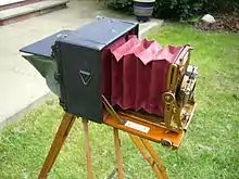 This type of camera was first developed in the era of the daguerreotype[2] (1840s–1850s) and is still in use today, some with various drive mechanisms for movements (rather than loosen-move-tighten), more scale markings, and/or more spirit levels. It comprises a flexible bellows that forms a light-tight seal between two adjustable standards, one of which holds a lens, and the other a ground glass or a photographic film holder or a digital back.[3] There are three general types, the rail camera, the field camera, and others that don't fit into either category.