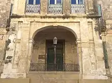 The villa is found just outside the outskirts[32] and suburb[33] of Valletta in the hamlet of Guardamangia[34] set just at the crest[35] in a quiet residential area[36] in a narrow street.[37] The villa is described as built in the form of a palace complemented with sea views over Marsamxett Harbour.[38] The Queen describes it as a "town house".[10] It is a typical traditional Maltese residence.[9] The building is built with limestone, known as sandstone and described by the Queen as "yellow stone",[10] and designed with spacious interiors.[39] The house has two entrances with one set at street level and another set after going up a flight of stairs under an elaborate front porch.[10] The royal family had taken their own personal belongings from Britain when they lived at the villa[40] allowing them to live in a lavish residence,[41] in a once-elegant home.[33] The royal family had British servants at the villa.[42]