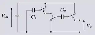 Conceptually, perhaps the simplest switched capacitor configuration is that shown schematically in figure 5. Here two capacitors are simultaneously charged to the same voltage in parallel. The supply is then switched off and the capacitors are switched into series. The output is taken from across the two capacitors in series resulting in an output double the supply voltage. There are many different switching devices that could be used in such a circuit, but in integrated circuits MOSFET devices are frequently employed.[10]