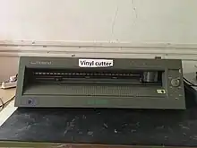 A vinyl cutter is a type of computer-controlled machine tool. The computer controls the movement of a sharp blade over the surface of the material as it would the nozzles of an ink-jet printer. This blade is used to cut out shapes and letters from sheets of thin self-adhesive plastic (vinyl). The vinyl can then be stuck to a variety of surfaces depending on the adhesive and type of material.