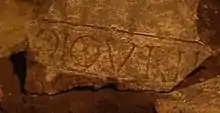 A second inscribed stone was discovered in 2001 by British Channel 4 Television's archaeological programme Time Team.[5] The stone was discovered as part of a late Roman or early Sub-Roman cist burial, being used as a side slab in the grave.[6] Located near the grave where the first inscribed stone was found, the inscription on this second stone reads: