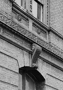 Detail of a building showing the Vitruvian scroll pattern rendered in terra cotta