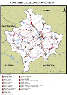 The settlement of Vlashnjë is located on the flat plateau of a raised rocky terrace 335 metres (1,099 ft) above sea level, on the Pristina-Zhur road about 6 kilometres (3.7 mi) west of Prizren. The toponym itself may refer to a nearby locality which was used at some point as grazing land by pastoral Vlachs. The site contains material from a number of periods, from the early Starčevo (early Neolithic) and Vinča cultures through the Copper, Bronze and Iron Ages to the Hellenistic, Late Antiquity and the Early Middle Ages. Archaeological evidence excavated at the site include clay pottery and vessel fragments, stone and bone tools, decorative and utilitarian artifacts and coins. They are comparable to material found at the nearby Prizren Fortress (~10 km to the east of Vlashnjë).[2] Excavations took place in 2002, 2006-2008 and 2010 as part of a joint archaeological project of the universities of Tirana and Pristina. They covered a total area of 816 m².[3]