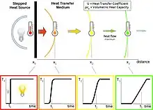 Thermal inertia is a term commonly used to describe the observed delays in a body's temperature response during heat transfers. The phenomenon exists because of a body's ability to both store and transport heat relative to its environment. Since the configuration of system components and mix of heat transfer mechanisms (e.g. conduction, convection, radiation, phase change) varies substantially between instances, there is no generally applicable mathematical definition for thermal inertia.[5] The phenomenon occurs in conjunction with a material's or a transport medium's heat transfer properties. A larger thermal storage capacity typically yields a more sluggish temperature response.