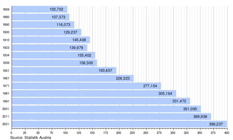 The population of Vorarlberg is 397,094 (as of 1 January 2020).[19] The majority (86%) of residents are of Austrian-Germanic stock with a cultural connection with Switzerland and Liechtenstein to the west and Germany to the north. A sizable proportion of the population's ancestors came from the Swiss canton of Valais in migrations of "Walsers", including the Swiss French in the 19th century by invitation during the days of the Austro-Hungarian Empire. There has been a sizable minority of Turkish descent since the 1960s.