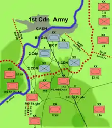 After the Dutch surrender, the Leibstandarte moved south to France on 24 May. Becoming part of the XIX Panzer Corps under the command of General Heinz Guderian, they took up a position 15 miles south west of Dunkirk along the line of the Aa Canal, facing the Allied defensive line near Watten.[54] A patrol from the SS-VT Division crossed the canal at Saint-Venant, but was destroyed by British armour. A larger force from the SS-VT Division then crossed the canal and formed a bridgehead at Saint-Venant; 30 miles from Dunkirk.[54] That night the OKW ordered the advance to halt, with the British Expeditionary Force trapped. The Leibstandarte paused for the night. However, on the following day, in defiance of Hitler's orders, Dietrich ordered his 3rd Battalion to cross the canal and take the heights beyond, where British artillery observers were putting the regiment at risk. They assaulted the heights and drove the observers off. Instead of being censured for his act of defiance, Dietrich was awarded the Knight's Cross of the Iron Cross.[56] On that same day, British forces attacked Saint-Venant, forcing the SS-VT Division to retreat.[54]