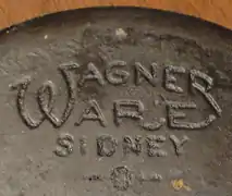 At first producing only cast-iron products, the company added nickel-plated ware in 1892.[1] In 1894 Wagner was one of the first to make aluminum cookware.[3] The company acquired their competitor Sidney Hollow Ware from Phillip Smith in 1897. A third brother, William H. Wagner, joined the company to run this operation. In 1903 Sidney Hollow Ware was sold back to Smith. By 1913 Wagner was distributing its products globally.[1] The company said in its early advertisements: