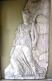 The main gate itself was covered by an outer wall, pierced by a single gate, which in later centuries was flanked by an ensemble of reused marble reliefs.[64] According to descriptions of Pierre Gilles and English travelers from the 17th century, these reliefs were arranged in two tiers, and featured mythological scenes, including the Labours of Hercules. These reliefs, lost since the 17th century with the exception of some fragments now in the Istanbul Archaeological Museum, were probably put in place in the 9th or 10th centuries to form the appearance of a triumphal gate.[74][75] According to other descriptions, the outer gate was also topped by a statue of Victory, holding a crown.[76]