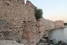 The inner wall is a solid structure, 4.5–6 m thick and 12 m high. It is faced with carefully cut limestone blocks, while its core is filled with mortar made of lime and crushed bricks. Between seven and eleven bands of brick, approximately 40 cm thick, traverse the structure, not only as a form of decoration, but also strengthening the cohesion of the structure by bonding the stone façade with the mortar core, and increasing endurance to earthquakes.[41] The wall was strengthened with 96 towers, mainly square but also a few octagonal ones, three hexagonal and a single pentagonal one. They were 15–20 m tall and 10–12 m wide, and placed at irregular distances, according to the rise of the terrain: the intervals vary between 21 and 77 m, although most curtain wall sections measure between 40 and 60 meters.[42] Each tower had a battlemented terrace on the top. Its interior was usually divided by a floor into two chambers, which did not communicate with each other. The lower chamber, which opened through the main wall to the city, was used for storage, while the upper one could be entered from the wall's walkway, and had windows for view and for firing projectiles. Access to the wall was provided by large ramps along their side.[43] The lower floor could also be accessed from the peribolos by small posterns. Generally speaking, most of the surviving towers of the main wall have been rebuilt in Byzantine or Ottoman times, and only the foundations of some are of original Theodosian construction. Furthermore, while until the Komnenian period, the reconstructions largely remained true to the original model, later modifications ignored the windows and embrasures on the upper story and focused on the tower terrace as the sole fighting platform.[44]