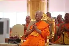 Somdet Chuang used to be monastic Chief of Region in the Northeast, South and North, respectively.[26][30] He later became Chief of the Northern Region and supervised missionary work abroad (ธรรมทูต, thammatut, Pali: dhammadūta), as well as Pali studies.[25][31][32] Moreover, Somdet Chuang significantly contributed to the compiling of a special Tipitaka set in honor of King Bhumibol's sixtieth anniversary.[33] In recognition of his merits, he received honorary degrees from the Mahachulalongkornrajavidyalaya University (MCU), Thammasart University and Sripatum University in Thailand.[31][34][35] He received the royal honorific names Phrasrivisuddhimoli (in 1956), Phraratchavethi (in 1962), Phrathepwarawethi (in 1967), Phra Thamthirarathmahamuni (in 1973), Phrathampanyabodi (in 1987) and Phra Maha Ratchamangalacharn (in 1995).[25][26] His last honorific made him officially a member of the Supreme Sangha Council.[25][31] He has presided over meetings of the council since 2005, when he became the acting Supreme Patriarch.[36][24]