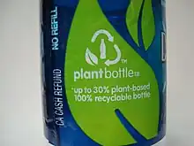 Label on disposable water bottle highlighting positive environmental attributes.