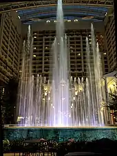 A water feature may be indoor or outdoor and can range in size from a desk top water fountain to a large indoor waterfall that covers an entire wall in a large building, and can be made from any number of materials, including stone, stainless steel, resin, iron and glass. Most water features are electronically controlled, ranging from simple timer actuators to sophisticated computerized controls for synchronizing music to water and light animation.