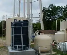 Chemical contact tank of FDA and NSF polyethylene construction, allows for retention time for chemical treatment chemicals to "contact" (chemically treat) with product water.