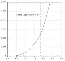 Graph of power versus speed for a displacement hull, with a mark at a speed–length ratio of 1.34