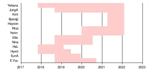 In 2017 and 2018, the group went through several lineup changes as Jaina, Woori, Vivian, Julie, Lina, and Suha left the group. A new member Cindy was added, but she also left the group. New members E.You, EunA, Ellie, JungA, & Nina were added, bringing the total number of members to six.
