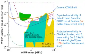 - ↑ CDMS Collaboration. "Results from the Final Exposure of the CDMS II Experiment" (PDF). Archived from the original (PDF) on 2009-12-29. Retrieved 2009-12-21.. See also a non-technical summary: CDMS Collaboration. "Latest Results in the Search for Dark Matter" (PDF). Archived from the original (PDF) on 2010-06-18.