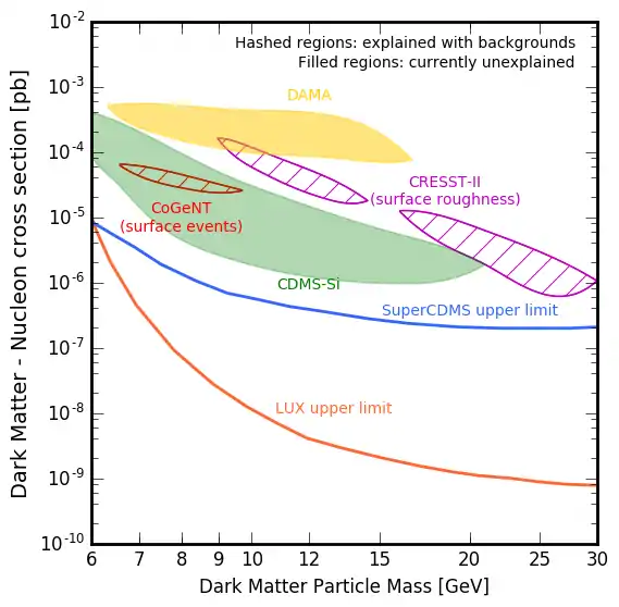 - ↑ Davis, Jonathan H.; McCabe, Christopher; Boehm, Celine (2014). "Quantifying the evidence for Dark Matter in CoGeNT data". Journal of Cosmology and Astroparticle Physics. 1408 (8): 014. arXiv:1405.0495. Bibcode:2014JCAP...08..014D. doi:10.1088/1475-7516/2014/08/014. S2CID 54532870.