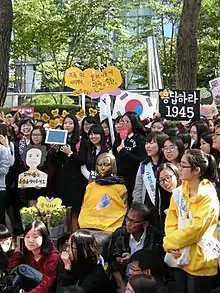 Wednesday demonstration (Korean: 수요 집회, romanized: Suyo jipoe), officially named Wednesday Demonstration demanding Japan to redress the Comfort Women problems (Korean: 일본군 위안부 문제 해결을 위한 정기 수요시위, romanized: Ilbongun Wianbu Munje Haegyeoreul Wihan Jeonggi Suyosiwi), is a weekly protest in Korea which aims at obtaining justice from the Japanese government regarding the large scale sexual slavery system established under Imperial Japan rule during World War II (its victims are commonly known under the euphemism "comfort women"). The weekly protest is held in the presence of surviving comfort women on every Wednesday at noon in front of the Embassy of Japan in Seoul.[1]