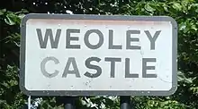 The area takes its name from the ruins of a moated and fortified manor house, now owned by Birmingham Museum & Art Gallery. The castle ruins are a Grade II listed building,[4] and the site became a Scheduled Ancient Monument in 1934.[5] The castle's individual name is from the Old English "Wēo-lēah" meaning "temple clearing". Before the Christian era there may have been a heathen temple here.[6]