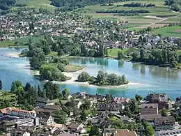 The boundary between the cantons of Thurgau and Schaffhausen, follows the center line of the Rhine here.[3]
