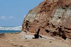 The Isle of Wight succession has two primary exposures, The major one being the several kilometre long section along the South West coastline around Brighstone Bay, and another smaller exposure on the South East coast near Yaverland. While the formation taken as a whole dates from the Berriasian to the Barremian, only the uppermost part of the formation is exposed on the Isle of Wight. With less than 200 metres of exposed composite stratigraphic thickness, and which dates from Hauterivian to Barremian.[11] A radiometric date has been obtained from the lower part of the succession, estimated to be 127.3 ± 2.7 million years ago.[12] This makes the formation coeval with upper portion of the Weald Clay in the Weald Basin. The primary lithology of the exposed portion of the formation on the Isle of Wight consists of featureless purple-red overbank mudstone, interbedded with sandstones. The environment of deposition was a floodplain within a narrow, east–west oriented valley.[13] The climate at the time of deposition is considered to be semi-arid, based on the presence of pedogenic calcrete nodules within the mudstones.[14] The "Pine Raft" horizon found near the base of the exposed portion of the formation includes calcitized conifer trunks up to metre in diameter and 2–3 metres long.[15]