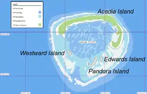 The atoll consists of four islets: Acadia—which is by far the largest—Pandora, Westward and Edwards.[36] All three of the smaller islets can be accessed on foot from Acadia at low tide.[32] The islets were named by Harald Rehder and John Randall, who visited the atoll during an expedition by the Smithsonian Institution in 1975.[37]