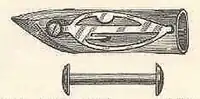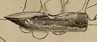 The first versions of the White Sewing Machine [4] used a "boat" shuttle that was comparable to those used in contemporary transverse shuttle machines. In 1886 the shuttle was changed to a bullet shape, with a thin rod in the interior upon which the bobbin rotates. The change was probably prompted by the bullet shuttle used in the new Singer Vibrating Shuttle machine, invented the year before, itself a derivative of the White machine. Still later, the shuttle was refined again for the Peerless machines.