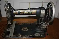 The White Sewing Machine was the first sewing machine from the White Sewing Machine Company.[1] It used a vibrating shuttle bobbin driver design. For that reason, and to differentiate it from the later White Family Rotary that used a rotary hook design instead, it came to be known as the "White Vibrating Shuttle" or "White VS". In 1879 it cost USD50 to US$125 (US$1097 to US$2744 adjusted) depending on which table or cabinet it was to be mounted in.[2] The White VS continued in production, with improvements, until the early 1900s.