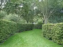 In the Western history of gardening, from the 16th to early 19th centuries, a wilderness was a highly artificial and formalized type of woodland, forming a section of a large garden.[1] Though examples varied greatly, a typical English style was a number of geometrically-arranged compartments (often called "quarters") closed round by hedges, each compartment planted inside with relatively small trees. Between the compartments there were wide walkways or "alleys", usually of grass, sometimes of gravel. The wilderness provided shade in hot weather, and relative privacy. Though often said by garden writers at the time to be intended for meditation and reading, the wilderness was much used for walking, and often flirtation. There were few if any flowers, but there might be statues, and some seating, especially in garden rooms or salle vertes ("green rooms"), clearings left empty. Some had other features, such as a garden maze.[1]