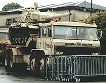 TG300 was the most powerful truck offered by the company, promoted as a 1000 toner ballast tractor capable of towing 1000 tons with a suitable hydraulic modular trailer. Trobosa, a Spain-based trailer manufacture also developed some TG300 models as it was a leading manufacturer of tank transporter and hydraulic modular trailer. In 1979 MOL Trucks acquired the design rights of the TG range from PRP and continued to manufacture heavy-duty ballast tractors mostly in 8x8 configurations and Cummins engine with towing capacity of 300 to 500 tons for oversize load transport applications.[9] In 1980 Creusot-Loire used TG range of trucks to develop their T40A military tank transporter in 8x6 configuration powered by a Detroit Diesel engine supported by a 13 speed Allison transmission.[10]