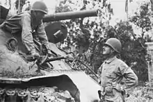 Major General Verne D. Mudge (in tank) confers with Brigadier General William C. Chase in Tacloban.