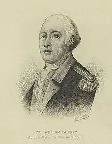 In 1769, Palfrey was Substitute Master of the Lodge of St Andrew, a masonic lodge warranted by the Grand Lodge of Scotland in 1756. Palfrey was Substitute Master when the Master was Joseph Warren and the lodge Secretary was Paul Revere. Member, St. Andrew's Lodge at Boston: EA, December 5, 1760; FC, December 18, 1760; MM, January 27, 1761, and later served as Junior Warden and Senior Warden of this Lodge. Palfrey, with seven others, petitioned the Massachusetts Grand Lodge on May 11, 1770, for new lodge under the title of The Massachusetts Lodge. The charter was granted May 13, 1770, and Palfrey's name is the second one on the charter. He is on record as SW of this lodge on June 1, 1770; elected WM December 3, 1770, and again, December 18, 1778. Elected Grand Secretary of the Massachusetts Grand Lodge December 4, 1778. "It was in all probability through the influence of William Palfrey, Grand Secretary, that the charter (The Massachusetts Lodge) was granted."[1][2]