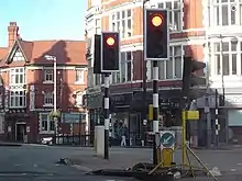 England's first automatic traffic lights could be seen in Princes Square in 1927.[41] The modern traffic lights at this location have the traditional striped poles to commemorate this fact. Princes Square was also the location of the United Kingdom's first pedestrian safety barriers, which were erected in 1934.[42] On 2 November 1927, the A4123 New Road was opened by the then-Prince of Wales (later Edward VIII)[43] linking the city with Birmingham. The New Road was designed as an unemployment relief project[44] and was the United Kingdom's first purpose-built intercity highway of the twentieth century.[45]