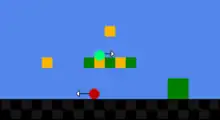 Schematic of the start of World 1-1. The Goomba (red) walks toward Mario and must be jumped over. The Mushroom (light green) appears after bumping into the golden block from below, and initially rolls to the right, until it falls off the platform and bounces against the pipe (green). The Mushroom then turns around and rolls toward Mario, who can easily receive it at this point.[2]