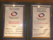 World Junior Championship banners awarded to John Morris and his two teams from 1998 and 1999.