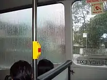 Shows how wet bus wrap distorts the view from inside through wrapped bus windows. The window on the left has a wrap advertisement on the outside whereas the window on the right does not.