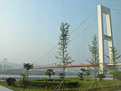 The Xiling Yangtze River Bridge (simplified Chinese: 西陵长江大桥; traditional Chinese: 西陵長江大橋; pinyin: Xīlíng Chángjiāng Dàqiáo), is a suspension bridge over the Yangtze River, just a few kilometers downstream from the Three Gorges Dam. The bridge is located within Yiling District of the prefecture-level city of Yichang (Hubei Province of China), connecting the towns of Taipingxi and Letianxi (on the left, northern bank of the river) with Sandouping (on the right, southern bank).