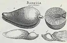 Engraving of Banksia pyriformis (fruit and seed) from Gaertner's 'De Fructibus...'