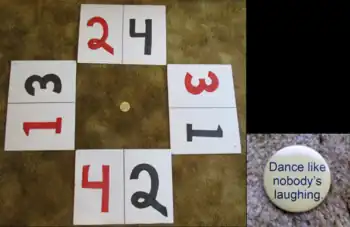Four large signs, each with a red and a black numeral are shown. During a teaching session of the dance Dutch Crossing, they are displayed on the four sides of a room and referred to as "wall numbers" or "orientations". Half of the dancers will use the black numbers and half will use the red numbers. So when the dance instructor announces "Face wall number 3" (for example), the dancers will be facing each other in opposite directions.