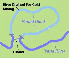 Gold was first discovered in Victoria near the Yarra River in Warrandyte. The find was made by Louis Michel in 1851 at a tributary of the river, Andersons Creek and marked the start of the Victorian gold rush. The approximate location of the site is marked by a cairn on Fourth Hill in the Warrandyte State Park. The river was drained and diverted in various areas throughout the gold rush to aid gold miners. An example of this is the tunnel at Pound Bend in Warrandyte. The river was partially dammed at Pound Bend near Normans Reserve at its eastern entrance and near Bob's wetlands at its western exit. Miners then blasted a 145m long tunnel through solid rock. The river was then fully dammed at the entrance and exit to the tunnel and water was diverted through 145m and out the other side leaving a 3.85 km of riverbed around Pound Bend exposed to the sun and the miners picks. Other diversions include The Island cutting in Warrandyte and the Little Peninsula Tunnel and Big Peninsula Tunnel near McMahons Creek.