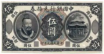 The Yellow Emperor continued to be revered after the Xinhai Revolution of 1911, which overthrew the Qing dynasty. In 1912, for instance, banknotes carrying Huangdi's effigy were issued by the new Republican government.[92] After 1911, however, the Yellow Emperor as national symbol changed from first progenitor of the Han race to ancestor of China's entire multi-ethnic population.[93] Under the ideology of the Five Races Under One Union, Huangdi became the common ancestor of the Han Chinese, the Manchu people, the Mongols, the Tibetans, and the Hui people, who were said to form the Zhonghua minzu, a broadly understood Chinese nation.[93] Sixteen state ceremonies were held between 1911 and 1949 to Huangdi as the "founding ancestor of the Chinese nation" (中華民族始祖) and even "the founding ancestor of human civilization" (人文始祖).[92]