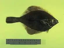 The yellowfin sole (Limanda aspera) is a flatfish of the family Pleuronectidae. It is a demersal fish that lives on soft, sandy bottoms at depths of up to 700 metres (2,300 ft), though it is most commonly found at depths of around 91 metres (299 ft). Its native habitat is the temperate waters of the northern Pacific, from Korea and the Sea of Japan to the Sea of Okhotsk, the Bering Sea and Barkley Sound on the west coast of Canada. Males grow up to 49 cm (19 in) in length, though the common length is around 33.5 cm (13.2 in). The maximum recorded weight is 1.7 kg (3.7 lb), and the maximum recorded lifespan is 26 years.[2][3]