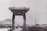Yeongeunmun (Korean: 영은문; Hanja: 迎恩門) or Yeongeunmun Gate was a Joseon-era former gate near present day Seoul, South Korea. Since it was a symbol of China's diplomatic influence on the Joseon, the Gaehwa Party of the Joseon government intentionally demolished it in February 1895, seeking for complete political independence of Joseon from China.