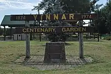 The Centenary Gardens located in Main Street were officially opened by William C. Welsh on 10 March 1974 to commemorate the centenary of the arrival of the first settlers in the Yinnar district. The gardens include the railway goods shed, play equipment, picnic tables, barbecue area, tourist information and public toilets.