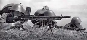 The Wehrmacht soon adopted the ZB-26 after the occupation of Czechoslovakia, renaming it the MG 26(t);[9] it was used in the same role as the MG 34, as a light machine gun. In the opening phases of World War II, the ZB-26 in 7.92 mm Mauser caliber was used in large numbers by elements of the German Waffen-SS, who at first did not have full access to standard Wehrmacht supply channels. In its most famous incarnation, the ZB-26 was modified by ZB and British technicians, entering service as the famous Bren gun.[10] Many more countries imported or produced the design under license, including China and Yugoslavia. Chinese Nationalist forces used the ZB-26 chambered for the 7.92×57mm Mauser round in their struggle with Communist Chinese and later Imperial Japanese forces. Likewise, the Chinese Red Army (as with any other captured weapon) turned the Nationalists' ZB-26 machine guns against them and the Japanese. According to Brno, from 1927 to 1939, a total of 30,249 ZB-26 were exported to China.[7] Various Chinese pro-Japanese forces, such as the Collaborationist Chinese Army[11] or the Inner Mongolian Army, used it.[12] During this time due to high demand, Chinese small-arms factories—state-owned as well as those controlled by various warlords—were producing the ZB-26 as the Type 26. During the Korean War, Chinese Communist forces employed the ZB-26/Type 26 against UN forces, and PVA ZB gunners developed a well-deserved reputation for long-range marksmanship. During the First Indochina War with French and later South Vietnamese forces, the ZB-26/Type 26 was found in the hands of both North Vietnamese Army and Viet Minh guerrillas.[13]