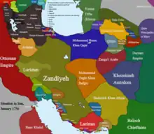 The dynasty was founded by Karim Khan Zand, chief of the Zand tribe, which is a tribe of Laks,[6][7][8] a branch of Lurs[6][9] who may have been originally Kurdish.[7][8] Nader Shah moved the Zand tribe from their home in the Zagros mountains to the eastern steppes of Khorasan. After Nader's death, the Zand tribe, under the guidance of Karim Khan, went back to their original land.[10] After Adil Shah was made king Karim Khan and his soldiers defected from the army and along with Ali Morad Khan Bakhtiari and Abolfath Khan Haft Lang, two other local chiefs, became a major contender but was challenged by several adversaries.[11] Abolfath Khan was the Vizier, Karim Khan became the army chief commander and Ali Morad Khan became the regent.[11]